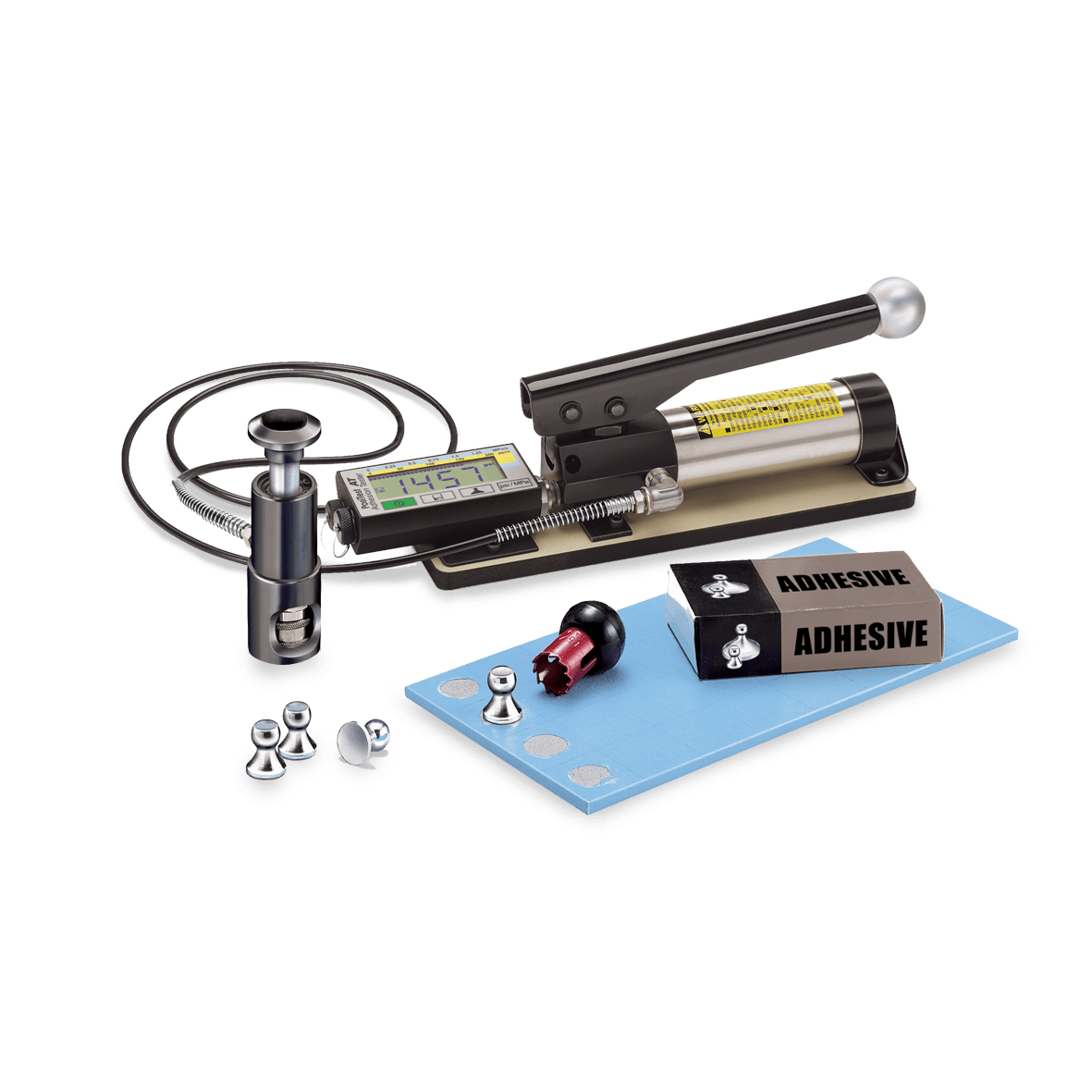 Cada sistema de pressão do Testador de adesão PosiTest é calibrado e certificado com ± 1% de precisão usando uma célula de carga rastreável NIST. A avaliação dos valores medidos no PC é possível usando um adaptador e software para PC.