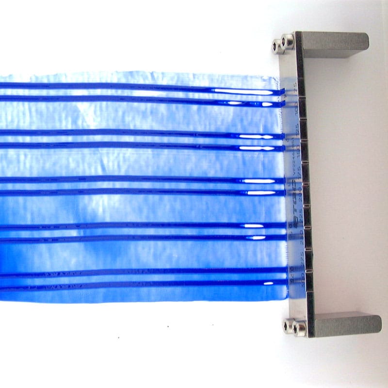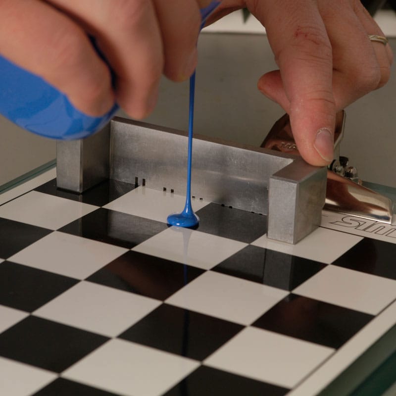 The TQC Sag and Levelling Film Applicator is a special film applicator with dual function. One side with 10 gaps from 75 to 300 micron to test the tendency to sag in relation to the film thickness. At the counter side 5 pairs of notches of increasing depth are made to create sets of two film stripes. The merging of the stripes can be evaluated to define the leveling ability. The high-grade stainless steel will not be affected by acid or base elements. Complies with ASTM D4400 and ASTM D2801.