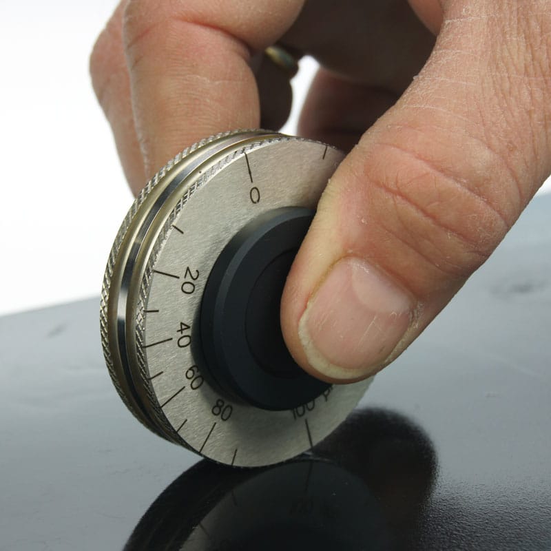Specially by TQC developed instrument for use on wet lacquers, paint and coil coated surfaces. Equipped with a precision roller-bearing for smooth rolling over the surface . The wheel has three rims, the inner rim being eccentric to the two outer rims. The outer rings are notched for a firm grip inthe surface to prevent slipping. Made of stainless steel and with an aluminum grip. AVAILABLE TO ORDER