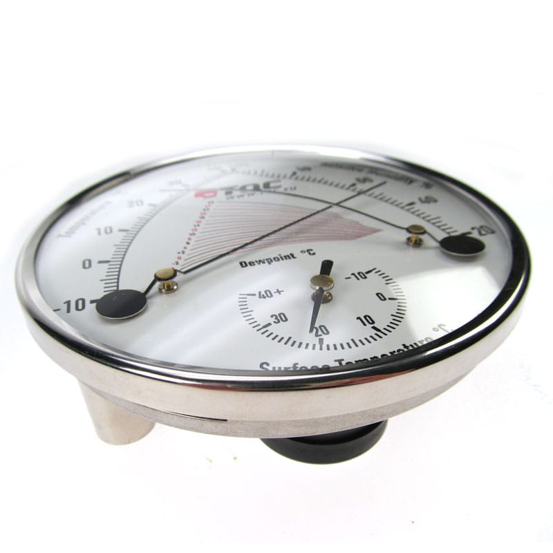 Termo-higrômetro contendo uma combinação de um higrômetro de precisão e dois termômetros bimetálicos. As escalas de umidade relativa e temperatura são dispostas de forma que seus indicadores cruzem uma série de curvas de indicação do ponto de orvalho no centro do mostrador. O ponto de orvalho pode ser lido diretamente na interseção dos dois ponteiros.