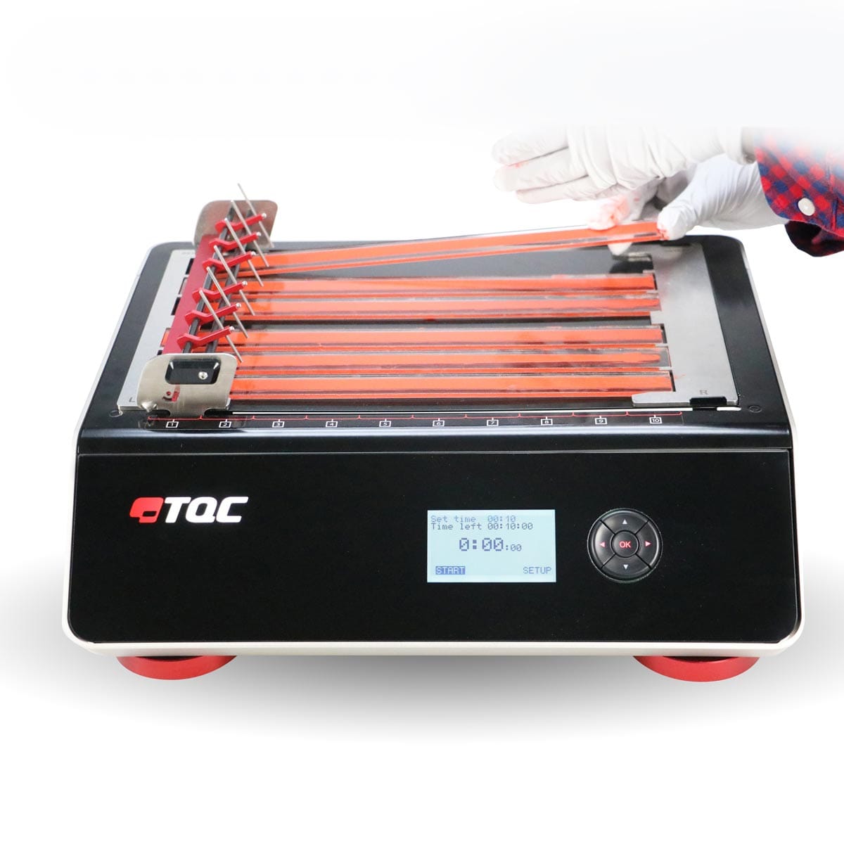 The TQC Drying Time Recorder is a fully digitally controlled machine to define the different stages in the drying process of paints and coatings. The TQC Drying Time Recorder operates conform the BK (Beck Koller) method. Defining the final result or checking intermediate stages is very easy by means of the clear digital display and the intuitive interface. The compact machine meets ASTM D5895, ISO 9117-4 and DIN EN 14022. The TQC Drying Time Recorder has six tracks, and comes with two robust and reusable glass beds of 100 X 350 X 3 mm. Optional are six narrow glass beds in special adapters.