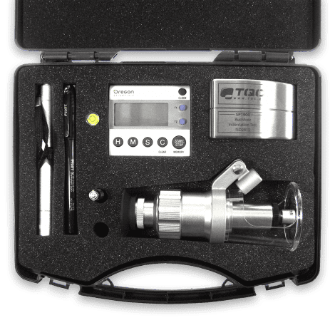 The TQC Buchholz Hardness Indentation Test provides a method for carrying out an indentation test on coatings complying with the ISO 2815-2003 standard. The TQC Buchholz Hardness Indentation Test consists of a calibrated slip-on weight with a sharp-edged metal wheel, an illuminated microscope, a level gauge, a digital dual timer, and two markers with template. The calibrated slip-on weight with sharp-edged metal wheel is positioned on the test specimen for a set period of time. The length of the indentation mark in the coating is an indication of the hardness of the surface. The Buchholz Hardness Indentation Test is a mandatory test in Qualicoat, QIB and GSB accredited laboratories. AVAILABLE TO ORDER