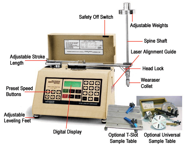 The TABER® Linear Abraser is designed to test virtually any size or shape specimen, the Linear Abraser is ideal for material properties of contoured surfaces and finished products. Initially developed to evaluate wear resistance, this instrument can also be used to evaluate scratch resistance (single or multiple pass), color transfer (commonly referred to as crocking or a crockmeter), and perform coin scrape tests. Plus, with the universal or a custom attachment, ‘real world’ testing and other forms of material durability can be performed. The Linear Abraser can be used for both wet and dry testing. The Taber Linear Abraser incorporates a horizontal arm that reciprocates in a linear motion. Attached to the end of the arm is a precision bearing spline shaft that creates a ‘free-floating’ test system and permits vertical movement. The test attachments are affixed to the bottom of the spline shaft and a weight support is mounted to the top. As the horizontal arm strokes back and forth, the test system raises or lowers vertically as the test attachment follows the contours of the specimen. A laser alignment guide assists with specimen set-up to ensures the abradant travels over the desired area. Adjustable settings enable the user to select the speed, stroke length and test load. The Linear Abraser includes six preset speed buttons, along with the ability to adjust the speed from 2 to 75 strokes per minute. Eleven stroke lengths are standard ranging from 0.2 inch to 4.0 inch. AVAILABLE TO ORDER